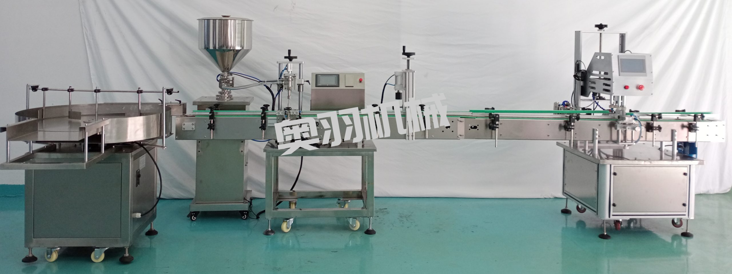 小型全自动液体灌装流水线组成:自动理瓶机+单头高速自动灌装机+自动压盖机+全自动旋盖机